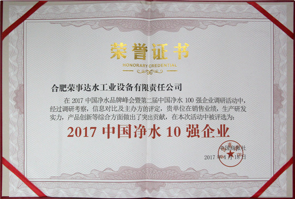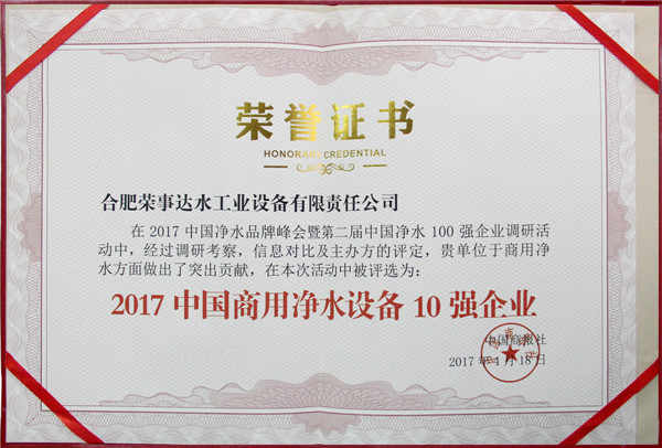 •        4月18日,2017中國凈水品牌峰會暨第二屆中國凈水100強(qiáng)企業(yè)頒獎(jiǎng)盛典在北京維景國際大酒店盛大舉行。榮事達(dá)憑借強(qiáng)勁實(shí)力和消費(fèi)者的信賴斬獲“2017中國凈水10強(qiáng)企業(yè)”、“2017中國商用凈水設(shè)備10強(qiáng)企業(yè)”、“消費(fèi)者滿意品牌”多項(xiàng)大獎(jiǎng)。