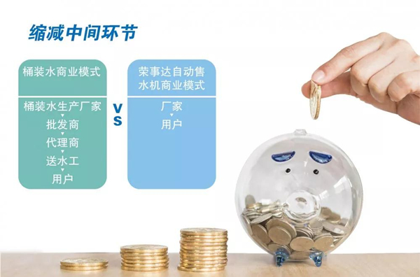 桶裝水的價格包含廠家生產成本、批發商差價、代理商差價、運輸成本、送水工人力成本等諸多費用,中間環節太多,最終還是有消費者買單,而自動售水機則是廠家直面用戶,大大縮減中間環節,讓利于客戶,一桶水的價格相比市面上的品牌桶裝水價格要少50%以上,大大節省企業開支。