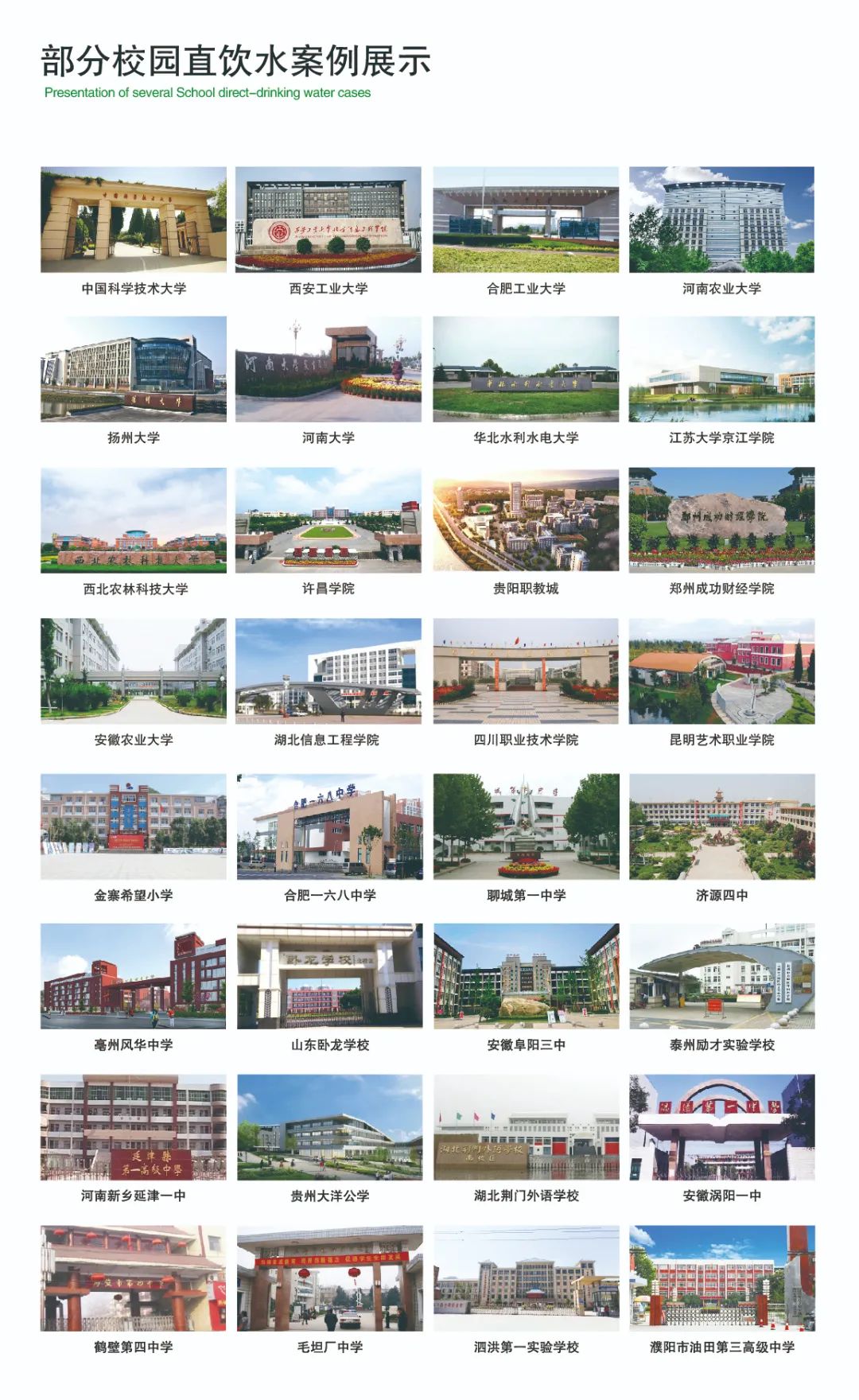 榮事達(dá)水工業(yè)先后承建了中國(guó)科學(xué)技術(shù)大學(xué)、河南大學(xué)、西北農(nóng)林科技大學(xué)、江蘇省丹陽(yáng)市第五中學(xué)等3000多所學(xué)校的直飲水工程,‘喝’護(hù)千萬(wàn)師生飲水健康。