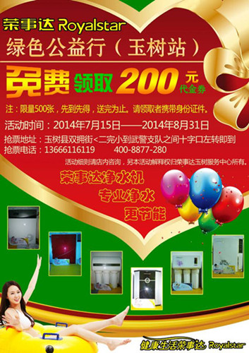 •     為實現(xiàn)“讓中國人喝上安全水”的夢想,榮事達(dá)水工業(yè)公司將在全國開展 “綠色公益行”活動,通過一系列為民、惠民的宣傳和服務(wù),關(guān)注居民飲水健康,倡導(dǎo)綠色生活。