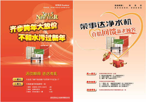 又至歲末,辭舊迎新,榮事達(dá)跨年獻(xiàn)禮,感恩回饋,再掀凈水狂潮。回首2014,居民飲水安全頻頻告急,安裝家用凈水機(jī)實(shí)現(xiàn)“純凈水自己造”,構(gòu)筑飲水安全最后一道防線,成為居民生活頭等大事。為普及凈水,元旦期間,榮事達(dá)將在全國多個省份推行惠民政策,加強(qiáng)推廣凈水機(jī)的力度。顧客在元旦期間進(jìn)店選購榮事達(dá)凈水機(jī),可獲得超值大禮。逛店拿紅包——顧客進(jìn)店咨詢產(chǎn)品信息,即可獲贈千元紅包;購機(jī)送好禮——購買榮事達(dá)純水機(jī),可獲贈管線機(jī)、凈洗機(jī)等精美大禮;歡樂抽大獎——顧客現(xiàn)場購機(jī)可參加抽獎活動,現(xiàn)金大獎、名牌家電、濾芯套裝等各項(xiàng)大獎送不停。開心跨年,悅享凈水。新的一年,榮事達(dá)凈水機(jī)將以更優(yōu)質(zhì)的產(chǎn)品、更好的服務(wù)加速凈水普及,真正讓惠于民,讓廣大消費(fèi)者喝上安全、健康的好水,提高居民生活品質(zhì)。- [關(guān)閉] [打印]